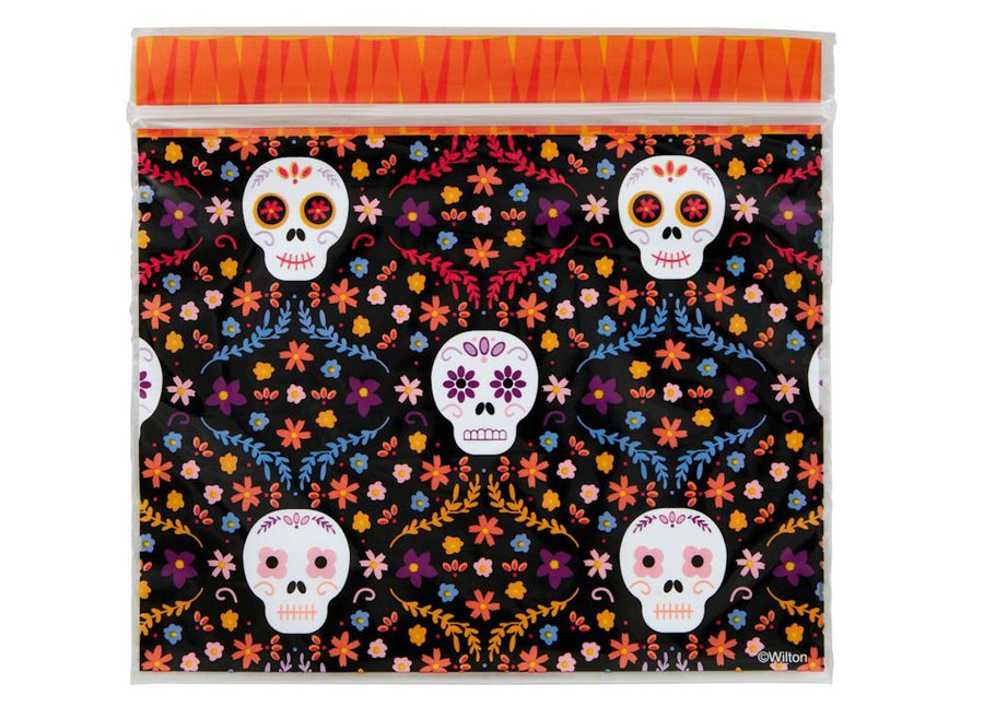 Fill these Dad of the Dead treat bags with lollies, homemade cookies and more. The bags feature a colourful sugar skull and floral design, and a resealable zip-lock style closure.