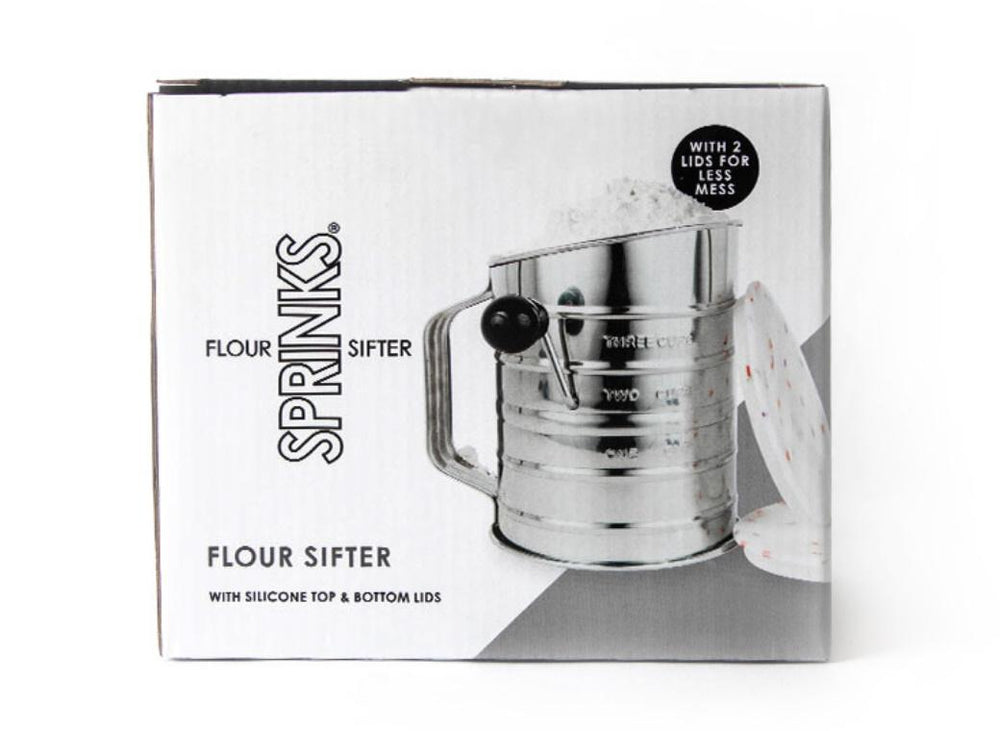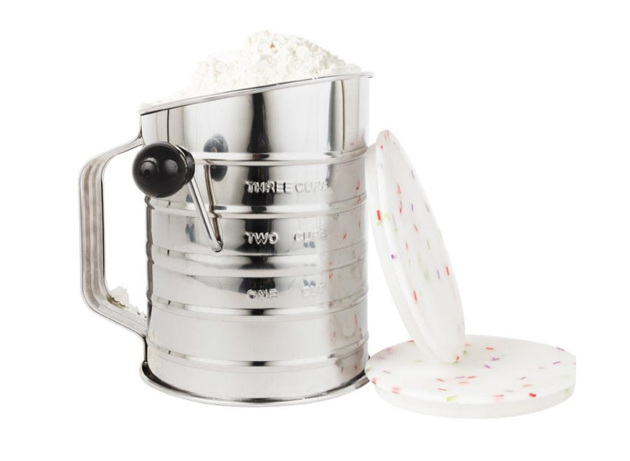 Stainless steel flour sifter with rotary hand crank.