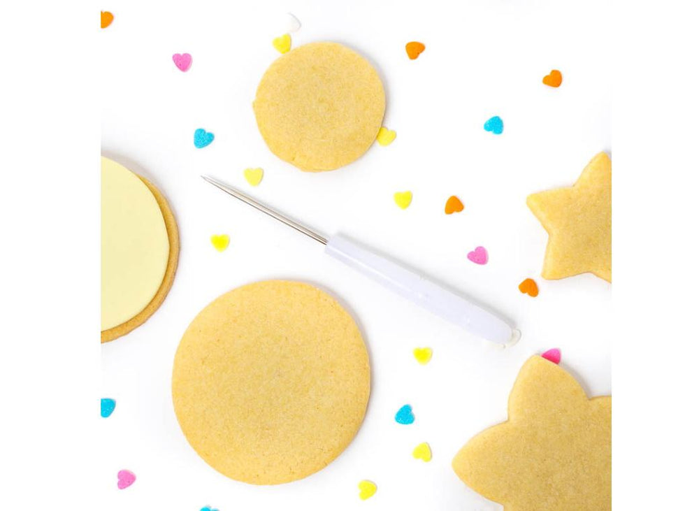It helps remove air bubbles, position sprinkles, and create marbled icing effects on decorated sugar cookies and other creations.